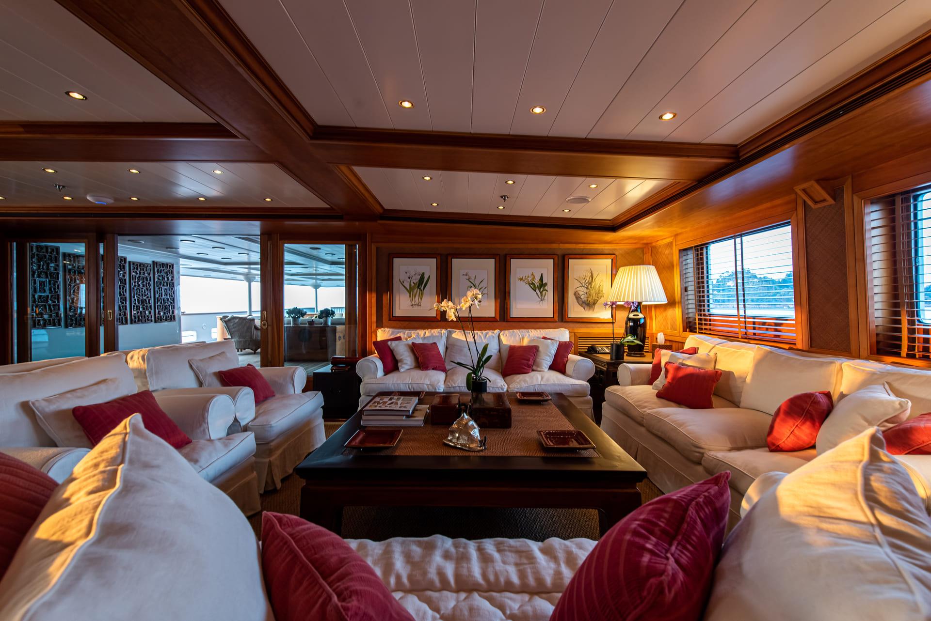 Die Gäste genießen zahlreiche Salon- und Gesellschaftsbereiche – von der Bibliothek über den Entertainment-Raum bis hin zum eleganten Speisesaal für 24 Personen. Im Außenbereich bieten die Decks Alfresco-Dining für bis zu 32 Gäste sowie großzügige Lounges mit Meerblick.