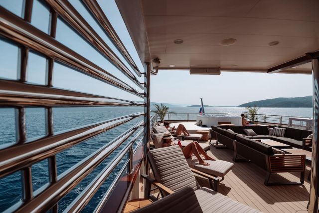 Erleben Sie die feinsten Annehmlichkeiten an Bord von M/Y Freedom. Das Sonnendeck ist Ihre persönliche Oase, komplett mit einem erfrischenden Swimmingpool, einem großen Whirlpool und einer privaten Bar. Dieser vielseitige Raum kann sich von einem ruhigen Wellness-Refugium mit Fitnessstudio und Yoga-Bereich in einen lebendigen sozialen Treffpunkt verwandeln, der sich perfekt für Unterhaltung und Cocktails unter dem Sternenhimmel eignet.