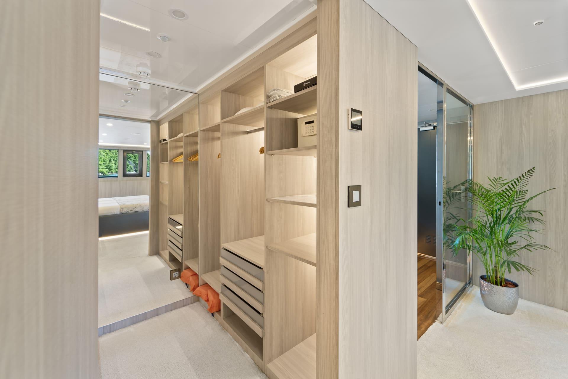 Hauptdeck-Master-Suite: Die zweite Master-Suite auf dem Hauptdeck ist ebenso opulent. Diese Suite verfügt ebenfalls über ein luxuriöses Doppelbett und ist von einem Ambiente raffinierter Eleganz umgeben. Sie bietet den Gästen einen ruhigen und privaten Rückzugsort mit dem zusätzlichen Komfort, sich auf der Hauptebene der Yacht zu befinden.