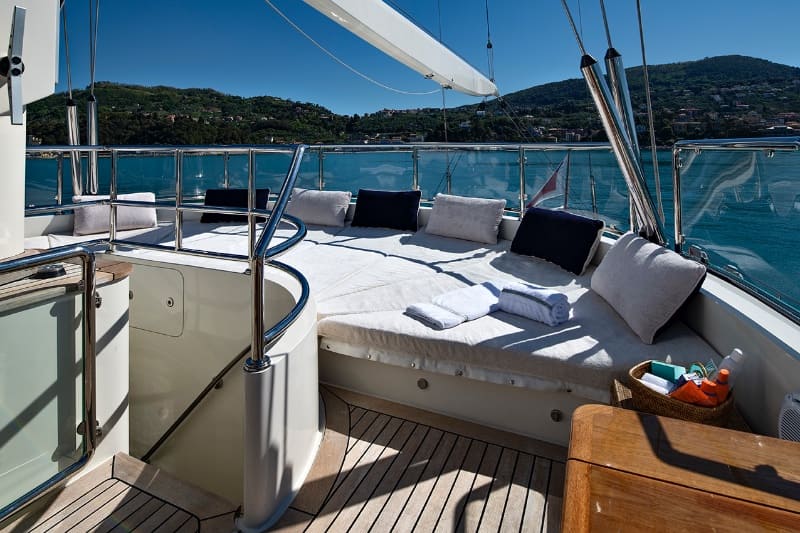 Die Außenbereiche von Jasali II sind ebenso beeindruckend. Das Cockpit im Heck eignet sich perfekt für Mahlzeiten im Freien, während das Sonnendeck mit Liegeflächen, einem zweiten Cockpit und einem externen Steuerbereich punktet. Gäste können auch den großzügigen Bugbereich genießen, der sich hervorragend zum Sonnenbaden oder für den Blick auf die See eignet. Eine ausfahrbare Badeplattform und ein stabiler Gangway im Heck sorgen für einfachen Zugang zum Wasser und zum Tender.