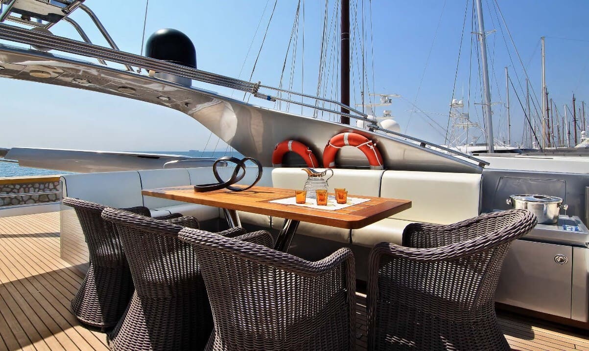 Diseñado para disfrutar del exterior, Elvi cuenta con generosos espacios exteriores ideales para tomar el sol y socializar. La amplia cubierta trasera ofrece áreas sombreadas para cenar al aire libre y relajarse, mientras que la proa y el flybridge son perfectos para disfrutar del sol mediterráneo. Para quienes prefieren la sombra, se pueden desplegar toldos para garantizar el confort durante los días más calurosos.