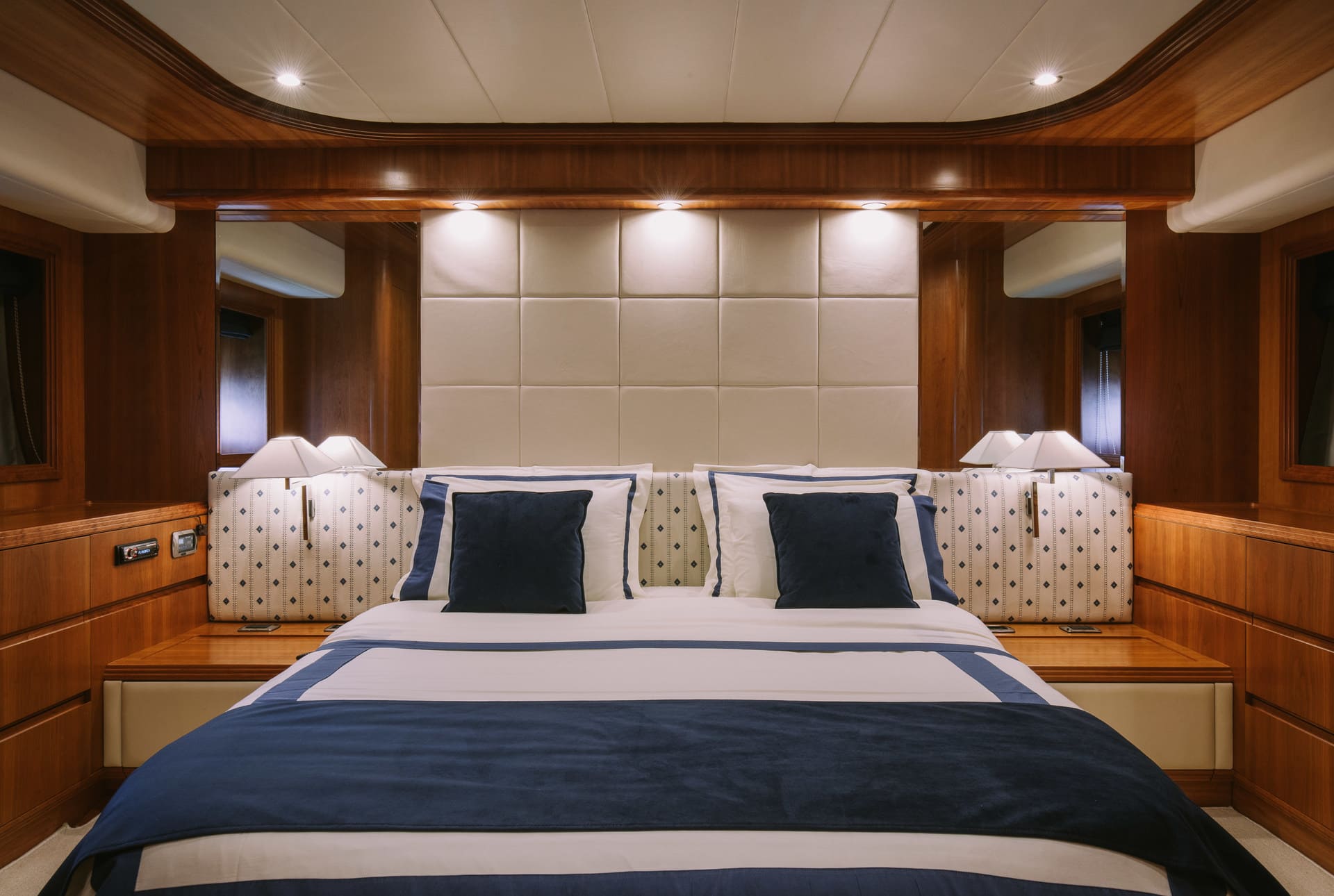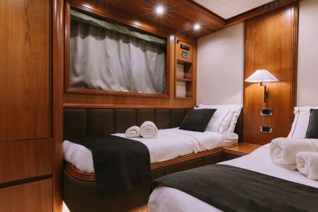 Ligeramente separado, el comedor es el entorno perfecto para degustar los espectaculares platos del chef de a bordo. Baje por las escaleras de cristal cercanas para llegar a los camarotes bien equipados que pueden alojar entre 8 y 10 personas con la máxima comodidad. En todos los camarotes hay abundantes paneles de madera de primera calidad que crean un ambiente relajante para una sensación acogedora. La suite principal es un espacioso oasis en el que podrá relajarse después de un largo día en el mar; un aspecto similar se aprecia también en la brillante suite VIP. Los otros dos camarotes tienen camas flexibles que pueden usarse como camas individuales o de matrimonio, según las preferencias del grupo. Cada camarote tiene un baño independiente y un televisor de pantalla plana.
