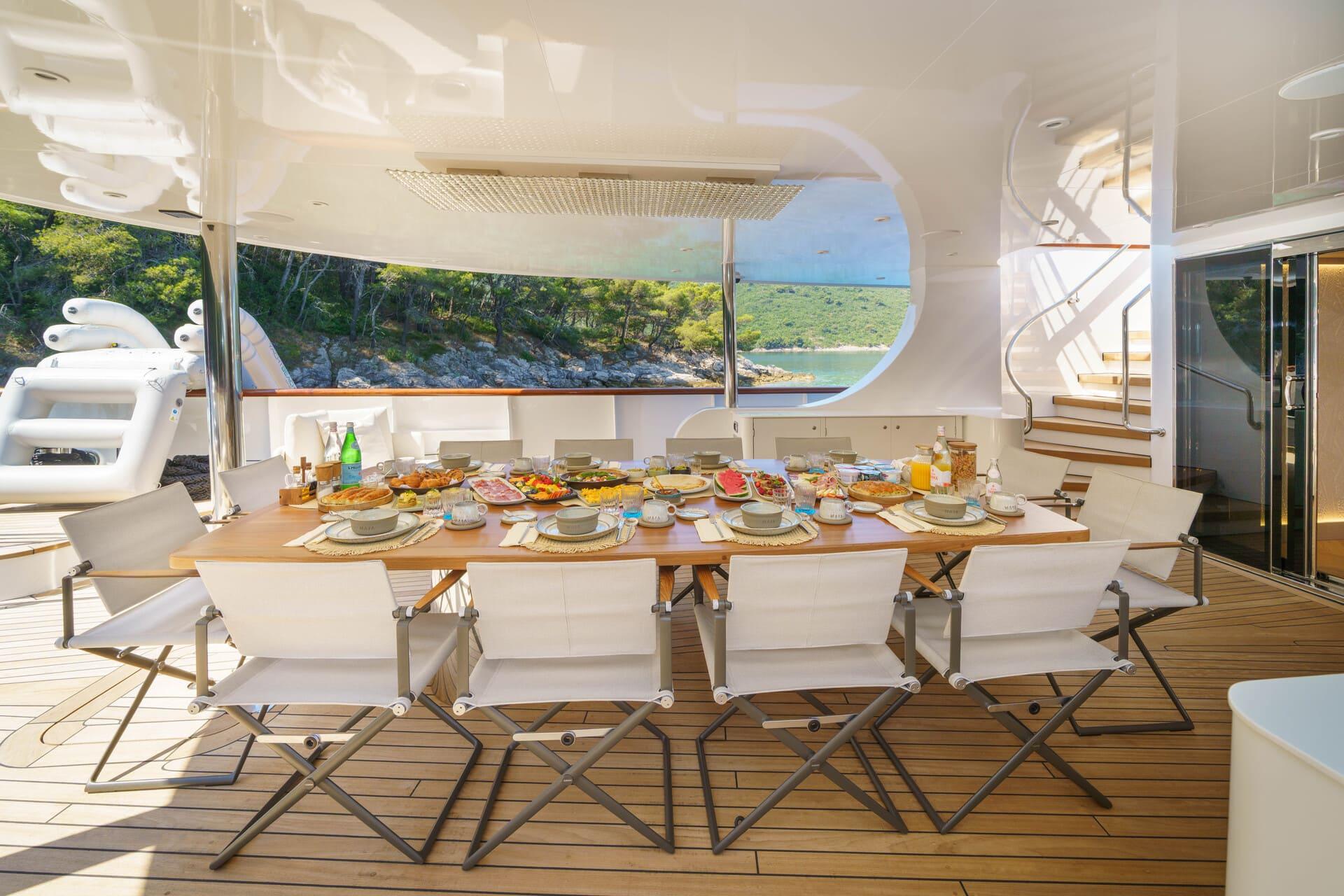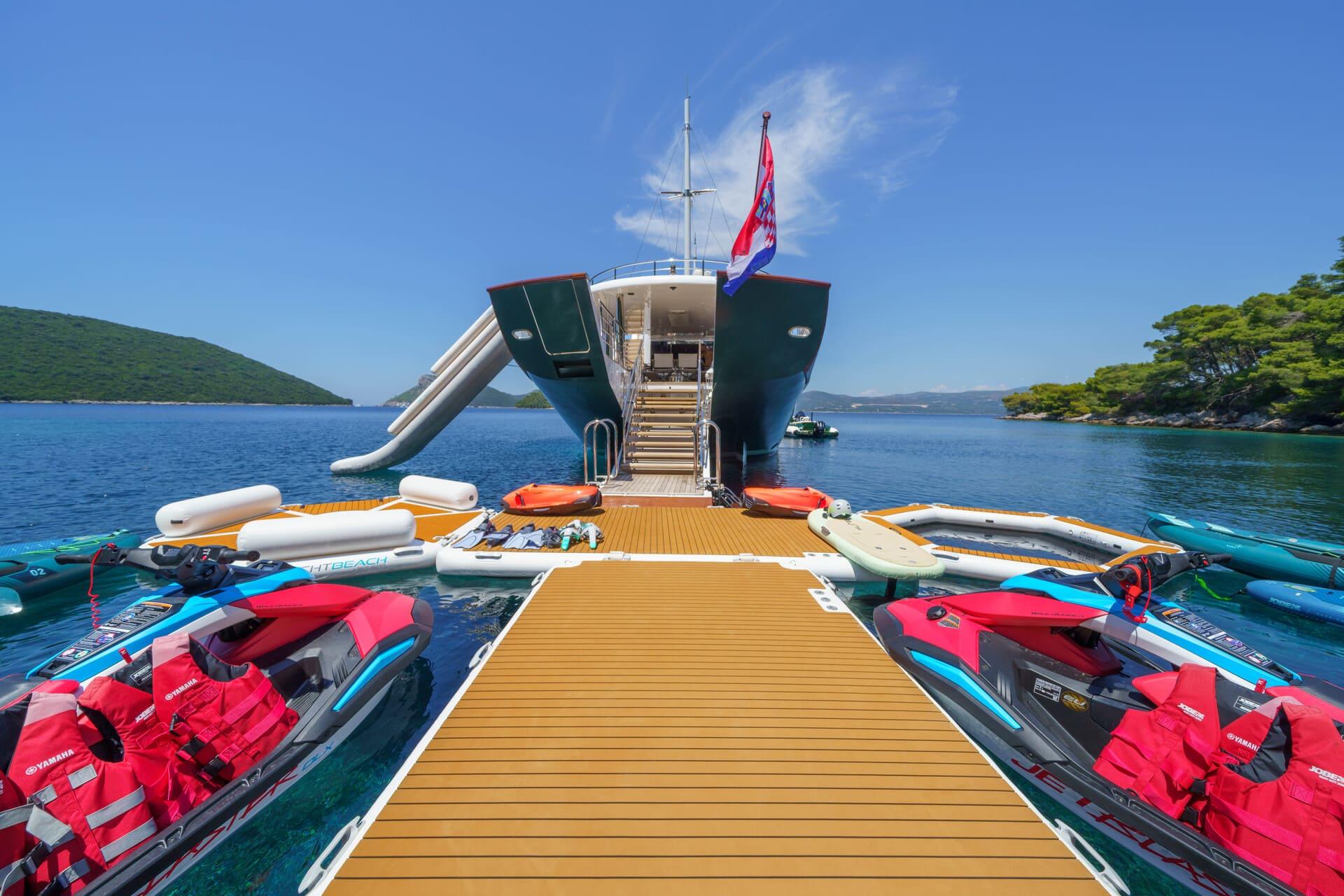El beach club y la amplia plataforma de baño ofrecen acceso directo al mar, mientras que la selección de juguetes acuáticos garantiza diversión en cada fondeo. Maia combina diseño moderno, tecnología y confort absoluto para ofrecer un charter exclusivo a lo largo de la costa croata.