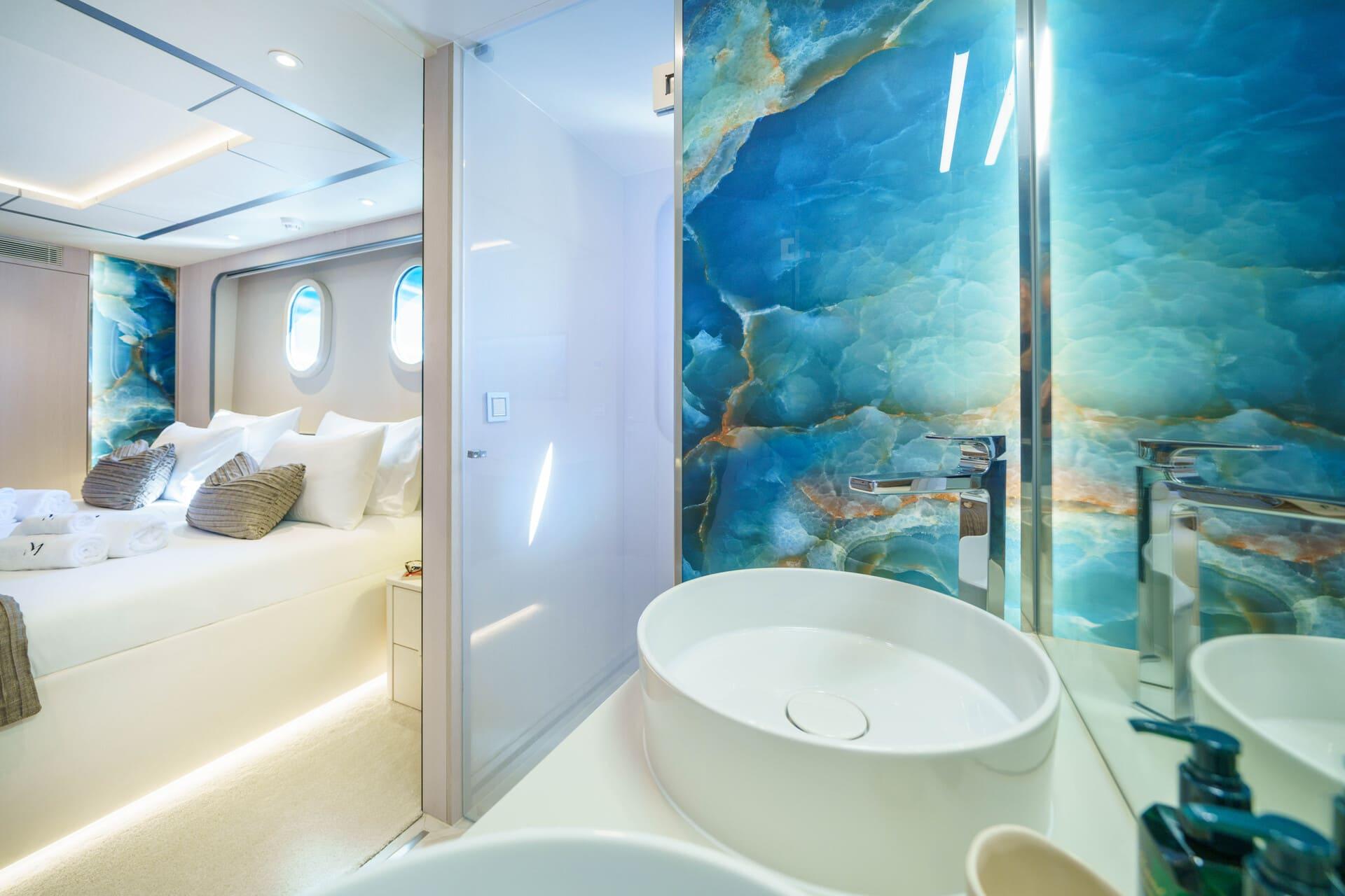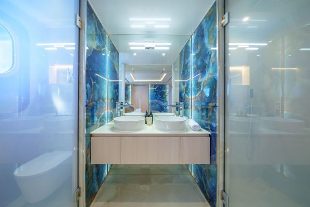 El interior destaca por su amplitud y luminosidad, con una altura de techos de 2,25 metros en todos los camarotes que refuerza la sensación de espacio. Tonos suaves y materiales cuidadosamente seleccionados crean un ambiente moderno y sereno. El salón principal ofrece amplias zonas de descanso y sistemas de entretenimiento integrados, mientras que una sala de cine independiente añade un toque exclusivo poco habitual en esta eslora.