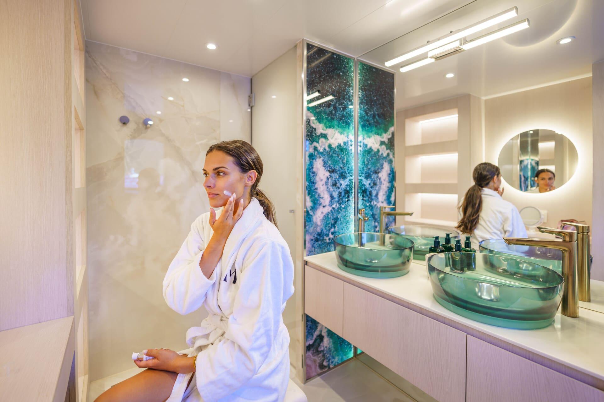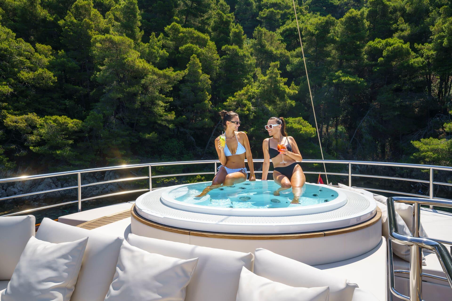 El bienestar es parte esencial de la experiencia a bordo gracias a una cabina dedicada al spa con sauna, equipo de gimnasio y mesa de masaje. El jacuzzi en la cubierta superior completa la propuesta de relajación con vistas panorámicas.