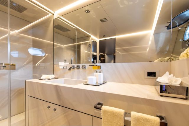 Cloud Atlas has an intelligent layout that sleeps up to 12 guests in 5 lavish cabins. If you choose the master suite, expect only the best - a king size bed invites you for restful nights, while a slightly separated office area allows maximum focus for demanding work. Her chaise lounge leans against a large window, and is a perfect little reading haven, while the bathroom uses a play of different marbles to create a nuanced look for private moments. The VIP suite is where art-deco meets minimalism, where retro portholes add spice to the glamorous atmosphere. You wouldn’t go wrong choosing one of two double cabins or one twin, either - all boast glossy furnishings and trendy ensuites. Last but not least, her skylounge converts into a romantic double cabin for stargazing before bedtime.