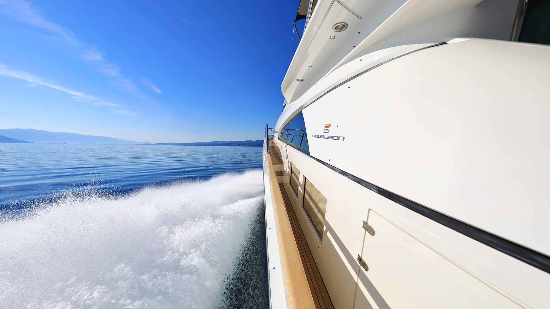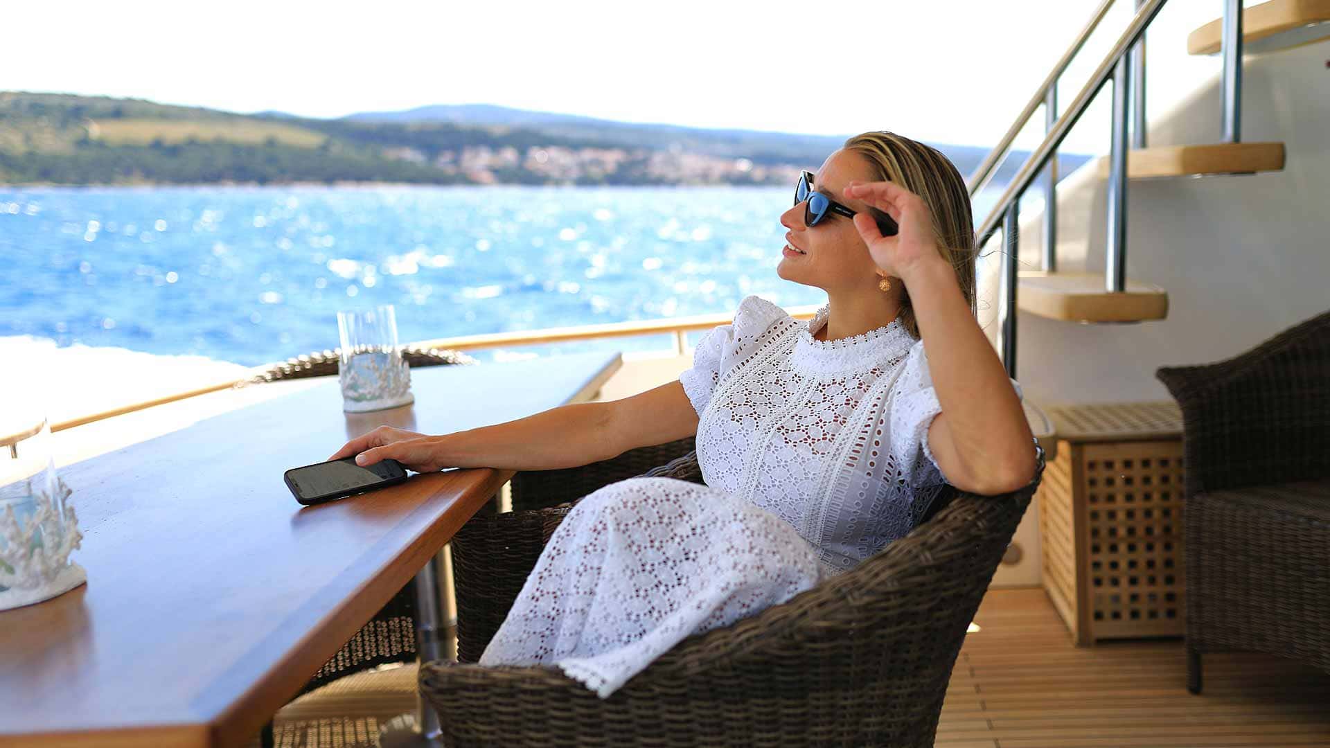 The wide hydraulic bathing platform can be transformed into your very own beach club, where you can surrender to the allure of the sparky seas on hot summer days. The aft deck has an elegant seating area perfect for an afternoon snack before you head to the creamy solarium forward, where you can work on your tan while watching Schatzi cut smoothly into waves.