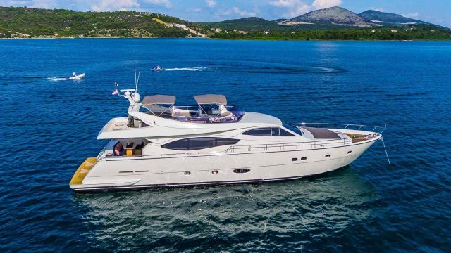 An immaculate motor yacht that enamours at first sight thanks to elevated aesthetics, Schatzi has a length of over 24 meters cleverly optimized to offer enormous volume that exceeds her size. The lovely Fairline Squadron 78 is not just a looker, but an overachiever, too - she cruises the sea contentedly at 25 knots, can reach a top speed of 32 knots, and boasts ultimate performances for an unforgettable adventure in the Mediterranean.